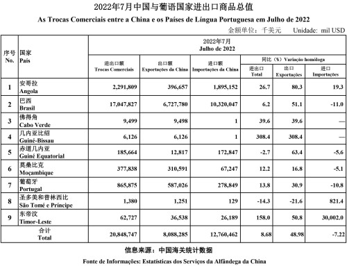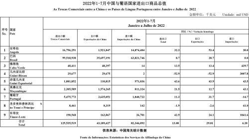 De acordo com os dados de Estatísticas dos Serviços da Alfândega da China (encontra-se na tabela anexada), as trocas comerciais entre a China e os Países de Língua Portuguesa de Janeiro a Julho de 2022 foram de 125,535 mil milhões de dólares, registando um aumento homólogo de 13.08%. As importações da China dos Países de Língua Portuguesa foram de 82,346 mil milhões de dólares, um aumento homólogo de 6.20%, enquanto as exportações da China para os Países de Língua Portuguesa foram de 43,189 mil milhões de dólares, um aumento homólogo de 29.01%.