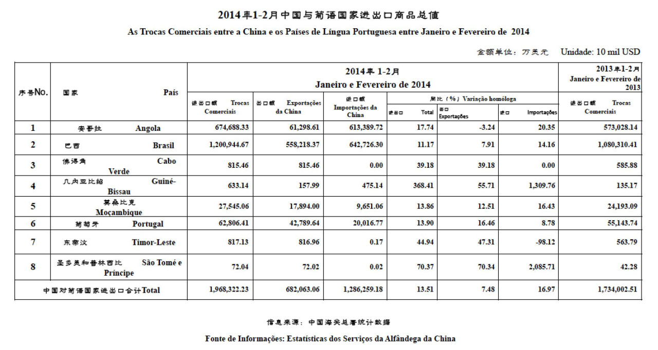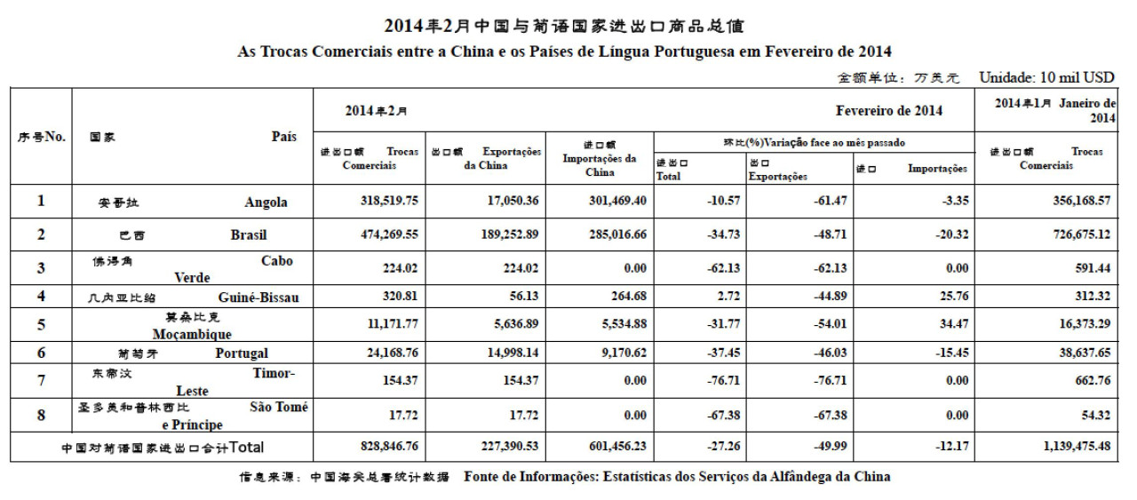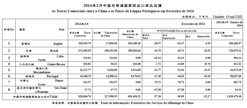 据中国海关总署资料显示,2014年1-2月中国与葡语国家进出口商品总值196.8亿美元,同比增长13.51%。其中,中国自葡语国家进口128.6亿美元,同比增长16.97%;对葡语国家出口68.2亿美元,同比增长7.48%。2014年2月,中国与葡语国家进出口额82.88亿美元,环比下降27.26%。其中,中国自葡语国家进口60.14亿美元,环比下降12.17%;对葡语国家出口22.74亿美元,环比下降49.99%。