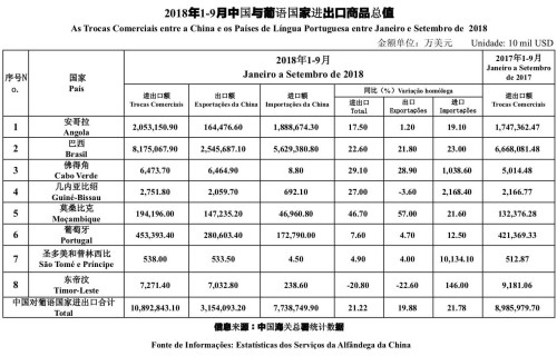 據中國海關總署資料(詳見附表)顯示,2018年1-9月中國與葡語國家進出口商品總值1089.28億美元,同比增長21.22%。其中中國自葡語國家進口773.97億美元,同比增長21.78%;對葡語國家出口315.41億美元,同比增長19.88%。2018年9月,中國與葡語國家進出口額136.23億美元,環比增長4.58%,其中中國自葡語國家進口100.89億美元,環比增長4.90%;對葡語國家出口35.33億美元,環比增長3.67%。