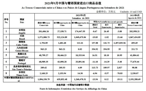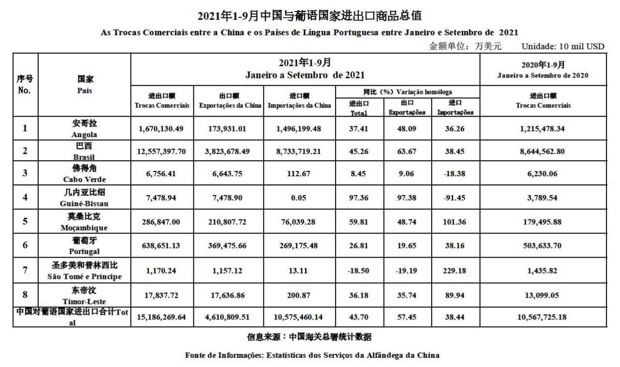 De acordo com as estatísticas dos Serviços da Alfândega da China, as trocas comerciais entre a China e os Países de Língua Portuguesa de Janeiro a Setembro de 2021 foram de US$151,863 mil milhões, um aumento homólogo de 43,7 por cento.