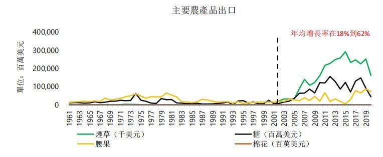 在2000年以後,出口也明顯增長,尤其是煙草的比重大幅上升,2005年至2020年間,煙草的年均增長率為18%,其原因在於:(1)2003年美國的Universal Corporation公司在莫桑比克投資設立了煙草公司Universal Leaf Tobacco,大幅增加了產量;(2)煙草國際市場價格上漲。制糖業受益於國際機構和該行業跨國公司的資助,許多工廠也得以恢復運作。腰果的比重則有所下降。從這兩幅圖可以看出,莫桑比克農產品進口高於出口,這說明經濟在不斷擴大,但生產卻無法滿足消費。