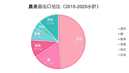 根據世行的數據,在2015年至2020年期間,五種商品佔農產品出口總額的87.9%:煙草佔48.5%,糖佔17.2%,腰果(加工和未加工)佔10.2%,香蕉佔7.7%,棉花佔4.4%。