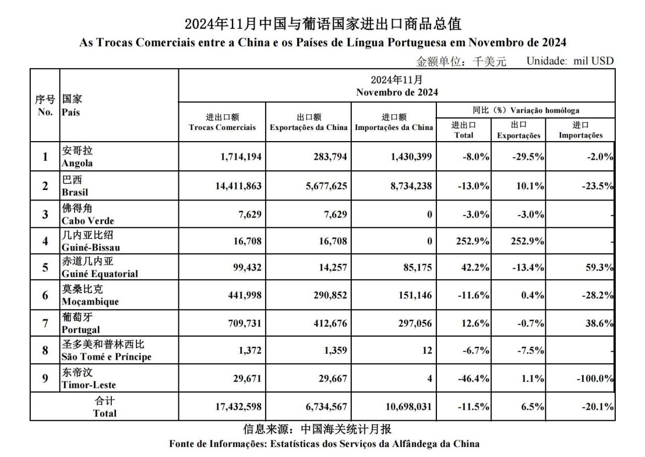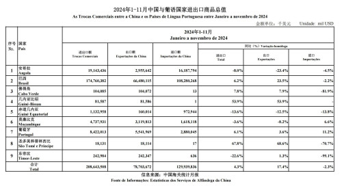 據中國海關數據(詳見附表)顯示,2024年1-11月中國與葡語國家進出口商品總值2086.44億美元,同比增長4.35%。其中中國自葡語國家進口1299.4億美元,同比下降2.26%;對葡語國家出口787.04億美元,同比增長17.45%。2024年11月,中國與葡語國家進出口總額174.33億美元,同比下降11.54%,其中中國自葡語國家進口106.98億美元,同比下降20.05%;對葡語國家出口67.35億美元,同比增長6.46%。