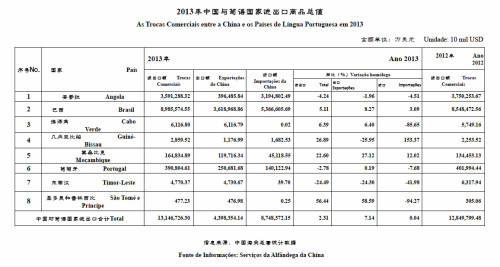 Trade between China and the Portuguese-speaking Countries hit US$131.4 billion in the whole of 2013, up by 2.31 percent from the previous year, according to data from the Chinese General Administration of Customs.