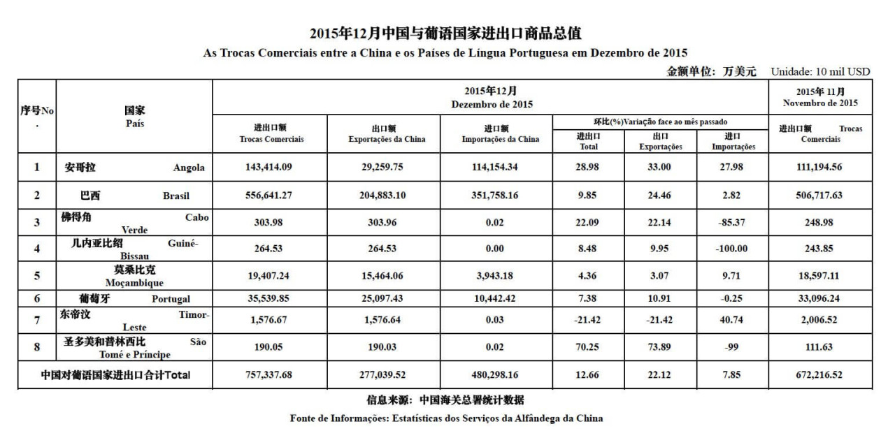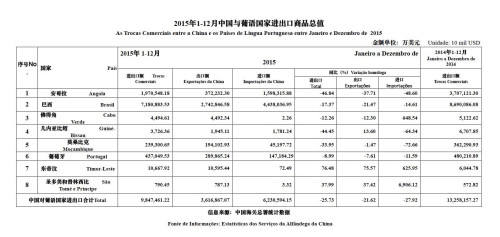 Portuguese-speaking Countries sold goods worth US$62.306 billion to China in full-year 2015 – a drop of 27.92 percent year-on-year. The value of China’s merchandise exports to those countries reached US$36.169 billion in the same period, down 21.62 percent year-on-year, according to Chinese official data.