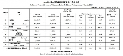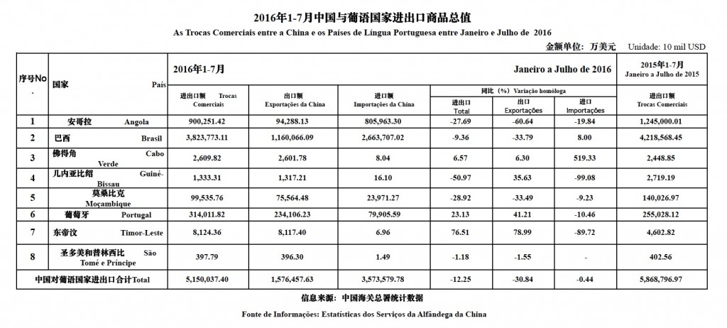 Portuguese-speaking Countries sold goods worth US$35.736 billion to China in the first seven months of 2016 – an increase of 0.44 percent year-on-year. The value of China’s merchandise exports to those countries reached US$15.765 billion in the same period, down 30.84 percent year-on-year, according to Chinese official data.