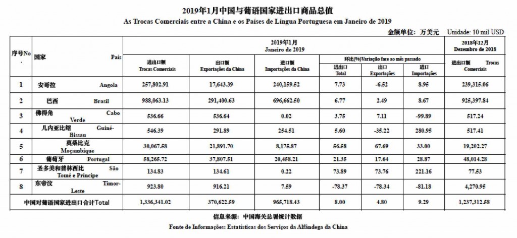 Trade between China and Portuguese-speaking Countries topped US$13.363billion in the first month of 2019, an increase of 27.97 percent from a year earlier and an 8.0-percent increase from the previous month, according to data from China Customs.