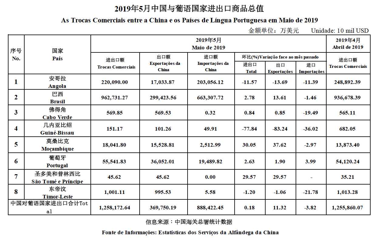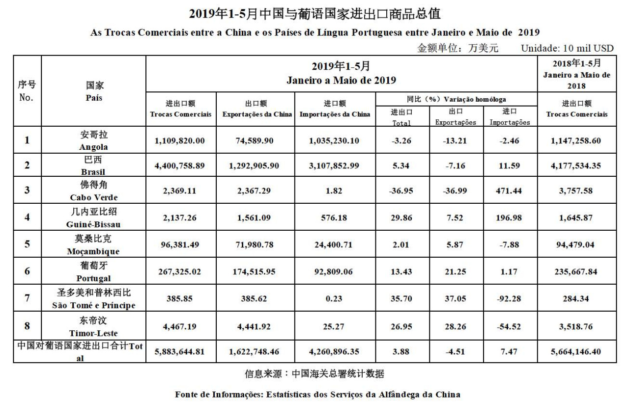 Portuguese-speaking Countries sold goods worth US$42.609 billion to China in the first five months of 2019 – a rise of 7.47 percent year-on-year. The value of China’s merchandise exports to those countries reached US$16,227 billion in the same period, down by 4.51 percent year-on-year, according to Chinese official data.