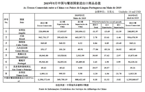 Trade in merchandise between China and Portuguese-speaking Countries reached US$58.836 billion in the period from January to May 2019. It represented a 3.88 percent increase year-on-year, according to data from China Customs.