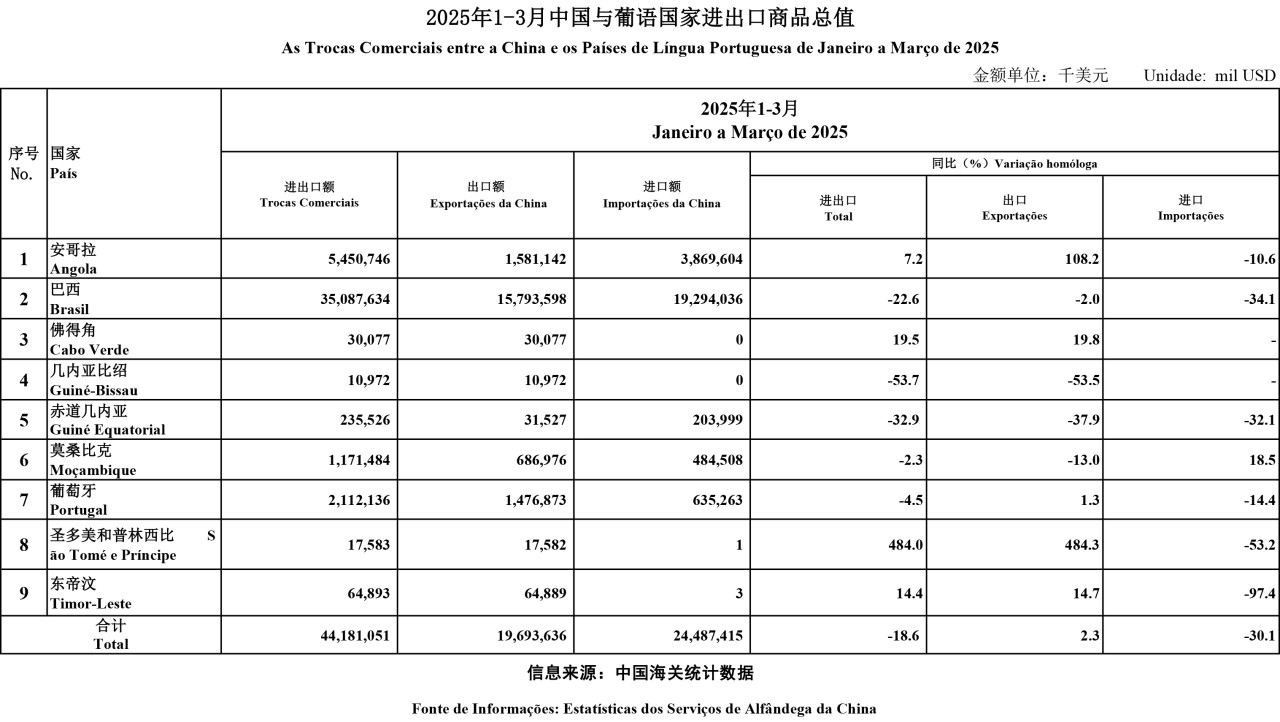 Trade in merchandise between China and Portuguese-speaking Countries reached US$44.181 billion in the period from January to March 2025. It represented a 18.62 percent decrease year-on-year, according to data from China Customs. Portuguese-speaking Countries sold goods worth US$24.487 billion to China in the three month of 2025 – a decrease of 30.12 percent year-on-year. The value of China’s merchandise exports to those countries reached US$19.694 billion in the same period, an increase of 2.33 percent year-on-year.