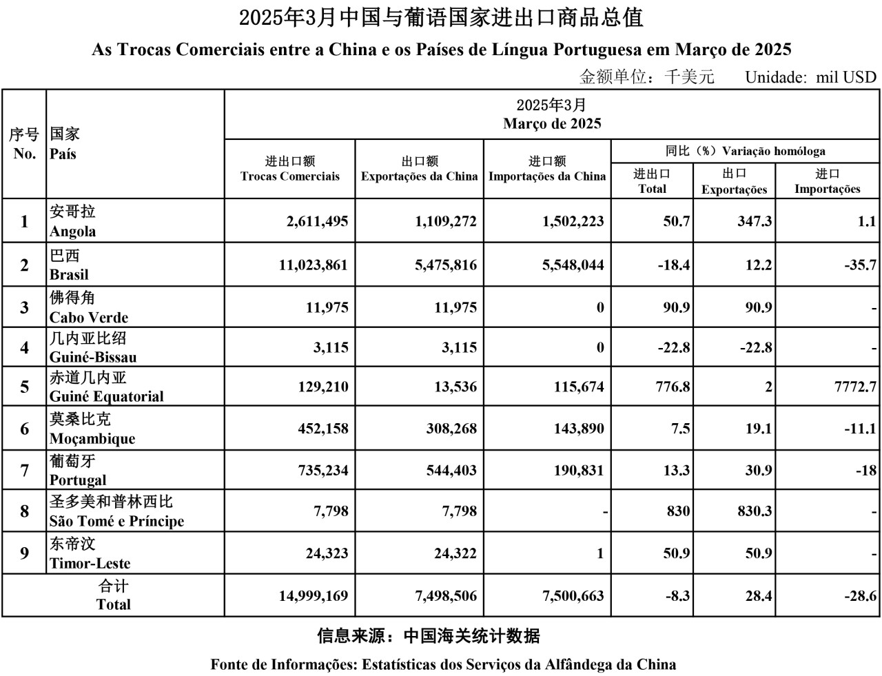 The total value of merchandise traded in March between the parties topped US$14.999 billion, a decrease of 8.28 percent from the prior-year period. The value of China’s merchandise imports from Portuguese-speaking Countries reached US$7.501 billion, down 28.64 percent year-to-year, according to Chinese official data. China sold goods to those countries worth US$7.499 billion in March, an increase of 28.36 percent compared with the previous year.