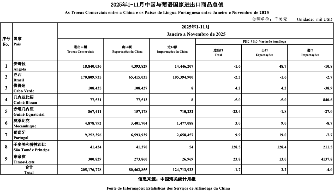 Trade in merchandise between China and Portuguese-speaking Countries reached US$205.177 billion in the period from January to November 2025. It represented a 1,66 percent decrease year-on-year, according to data from China Customs. Portuguese-speaking Countries sold goods worth US$124.714 billion to China in the first eight month of 2025 – a decrease of 4.02 percent year-on-year. The value of China’s merchandise exports to those countries reached US$80.463 billion in the same period, an increase of percent year-on-year.