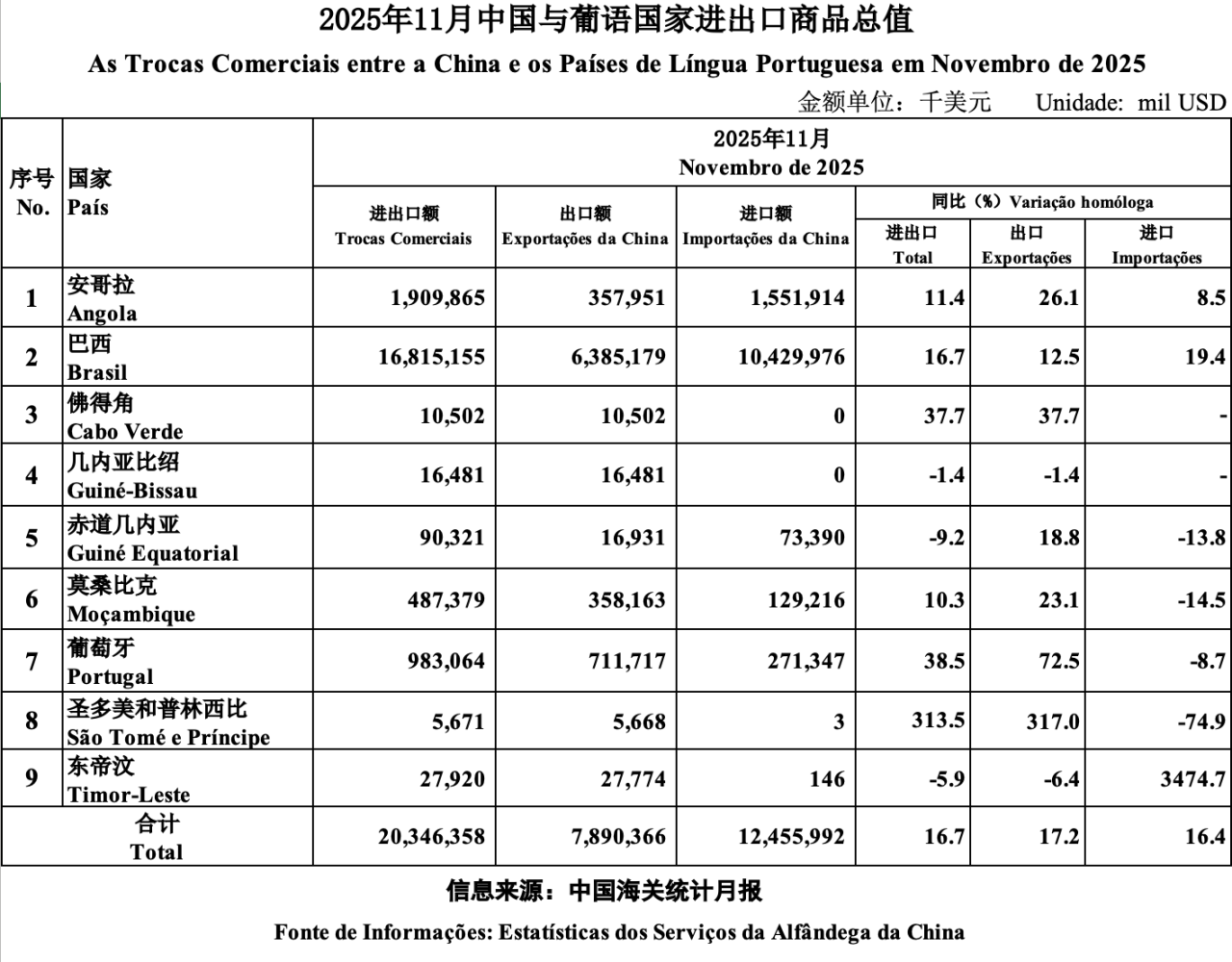 The total value of merchandise traded in November between the parties topped US$20.346 billion, an increase of 16.71 percent from the prior-year period. The value of China’s merchandise imports from Portuguese-speaking Countries reached US$12.456 billion, up 16.43 percent year-to-year, according to Chinese official data. China sold goods to those countries worth US$7.890 billion in August, an increase of 17.16 percent compared with the previous year.