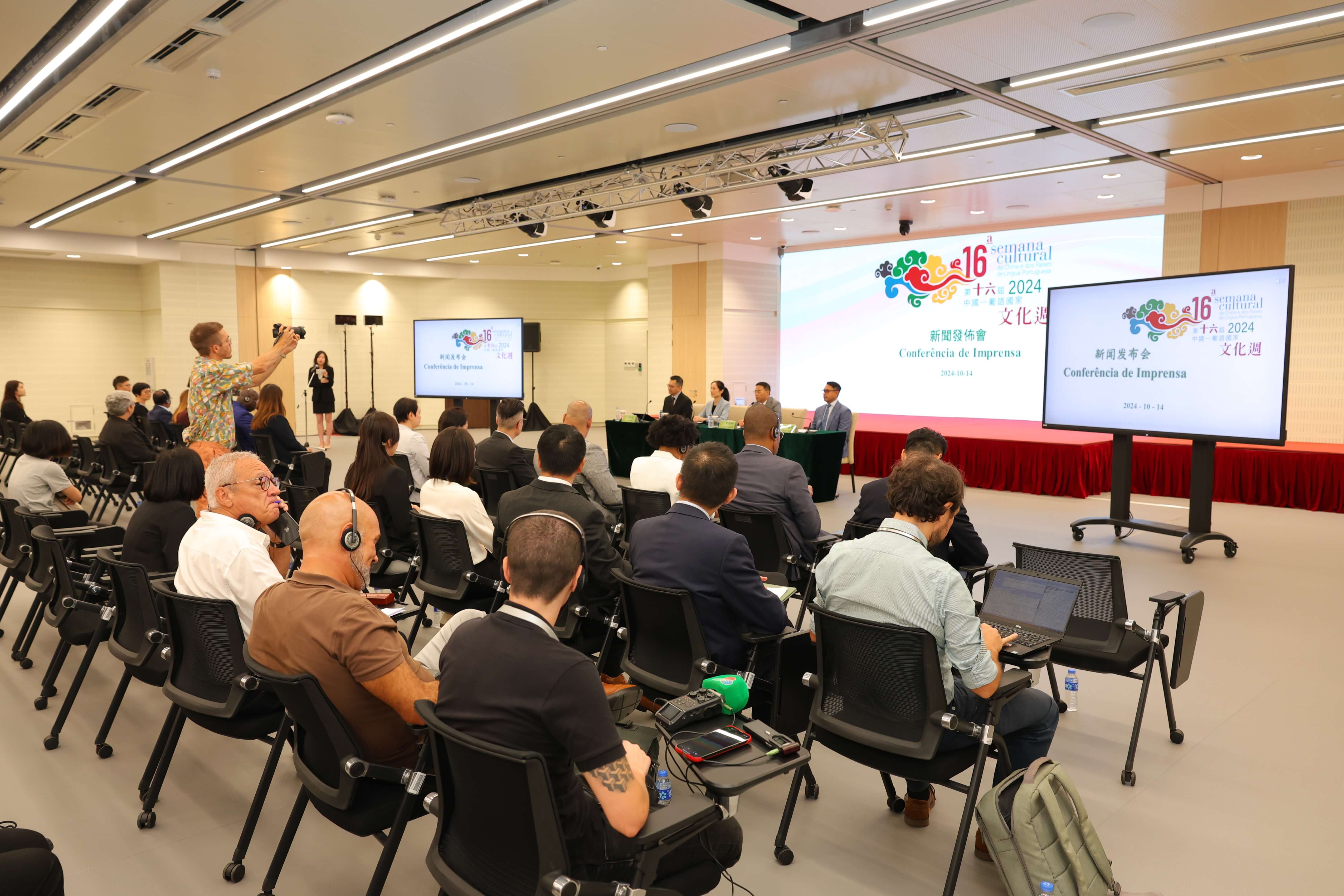 由中國—葡語國家經貿合作論壇(澳門)常設秘書處主辦的第十六屆中國-葡語國家文化週將於今年10月17日至20日隆重舉行,邀請中國與葡語國家藝術家、文藝團體、廚師等,來澳開展文化交流活動。10月14日,主辦單位在中葡綜合體新聞中心舉行新聞發佈會,常設秘書處秘書長季先峥、副秘書長謝穎、東晨光及輔助辦公室主任余雨生等出席並介紹活動相關情況。