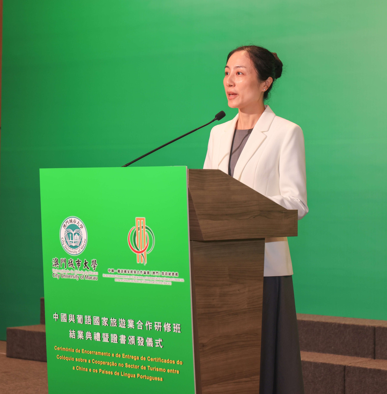 中葡論壇常設秘書處副秘書長謝穎、澳門城市大學副校長葉桂平、研修班輪值班長Magda Soares de Sousa Bandeira Lopes出席典禮並致辭。謝穎副秘書長致辭表示,通過簽署《經貿合作行動綱領(2024-2027)》,中葡論壇與會各方在文旅合作方面達成三項共識:深化文旅交流合作,推動文化中心互設及人才培訓,支持澳門舉辦文化交流活動。為落實行動綱領,中方專門成立了後續行動委員會,推動與葡語國家開展包含文旅合作在內的各領域交流合作。多年來,常設秘書處與澳門城市大學、澳門旅遊局合作,為葡語國家旅遊業官員提供研修實習機會,並為其推介葡語國家旅遊資源提供便利。未來,常設秘書處將繼續舉辦並參與各類經貿及人文交流活動,促進與葡語國家全方位互利合作。