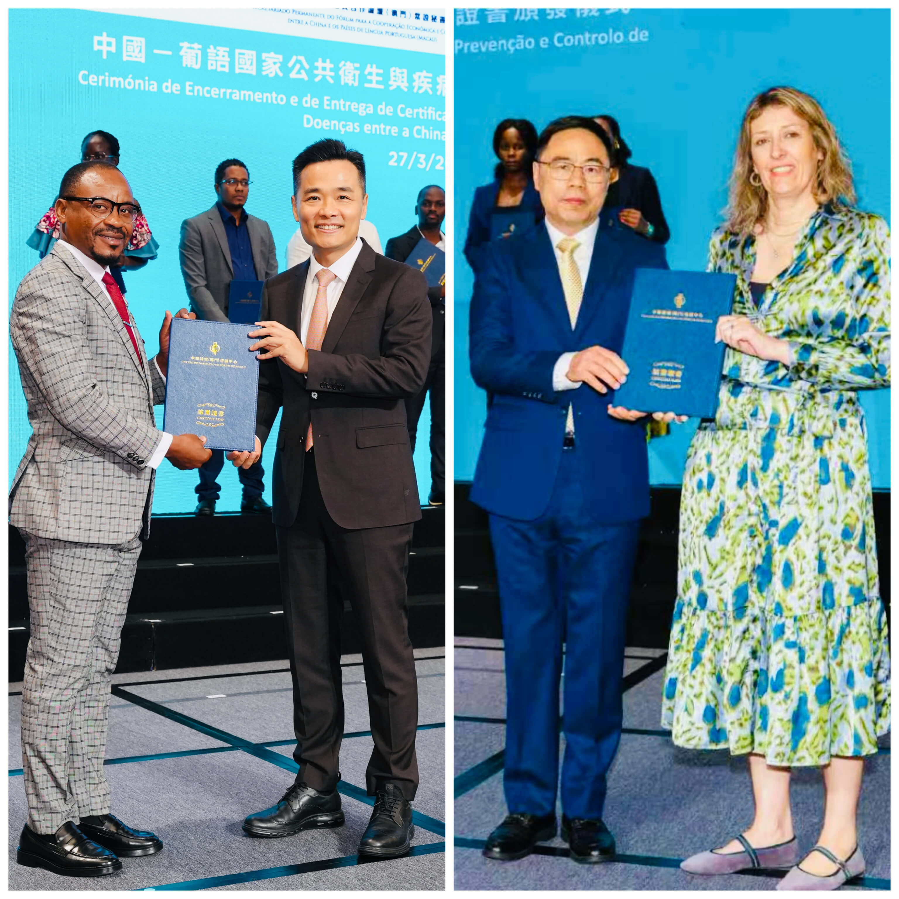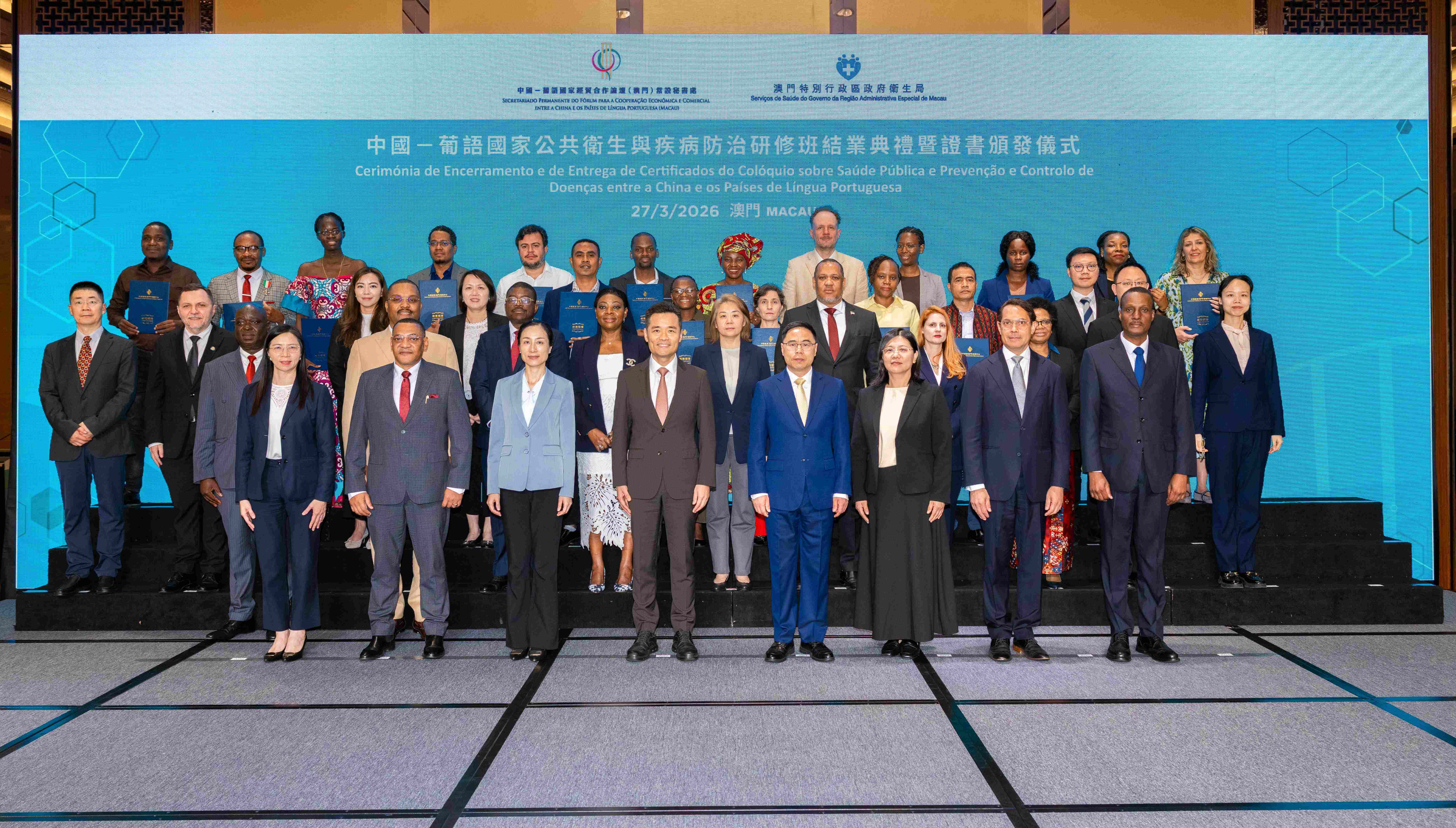 3月27日,由中國-葡語國家經貿合作論壇(澳門)常設秘書處與澳門特區政府衛生局聯合主辦的“中國-葡語國家公共衛生和疾病防治研修班”在澳門銀河國際會議中心舉行結業禮。本期研修班於3月16日至27日舉辦,共有19名來自中國內地及九個葡語國家的官員和技術人員參加。中葡論壇(澳門)常設秘書處秘書長季先峥、澳門衛生局局長羅奕龍、研修班輪值班長安娜•克莉絲蒂娜出席結業禮並致辭。