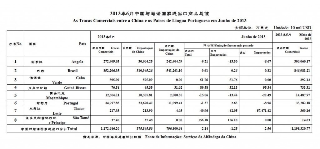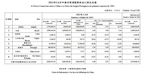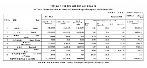 De acordo com as estatísticas dos Serviços da Alfândega da China, as trocas comerciais entre a China e os Países de Língua Portuguesa no primeiro semestre de 2013 foram de US$60,54 mil milhões, um decréscimo homólogo de 4,96%.