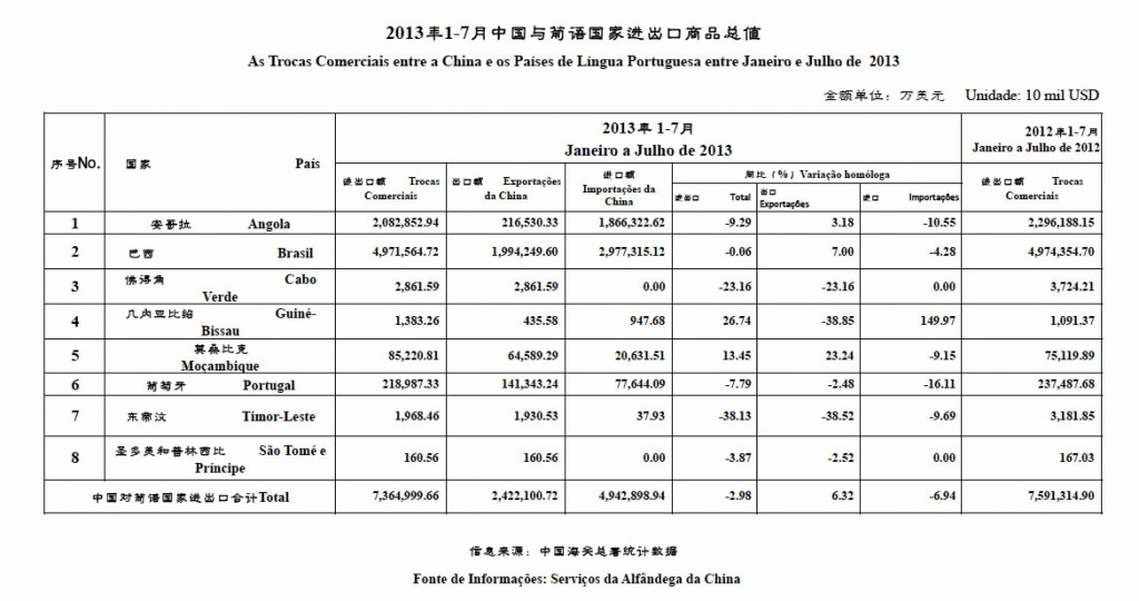 De acordo com as estatísticas dos Serviços da Alfândega da China, as trocas comerciais entre a China e os Países de Língua Portuguesa entre Janeiro e Julho de 2013 foram de US$73,65 mil milhões, um decréscimo homólogo de 2,98%.