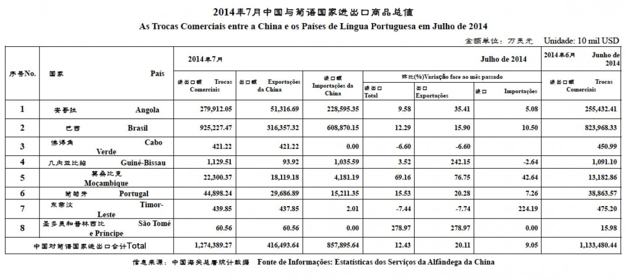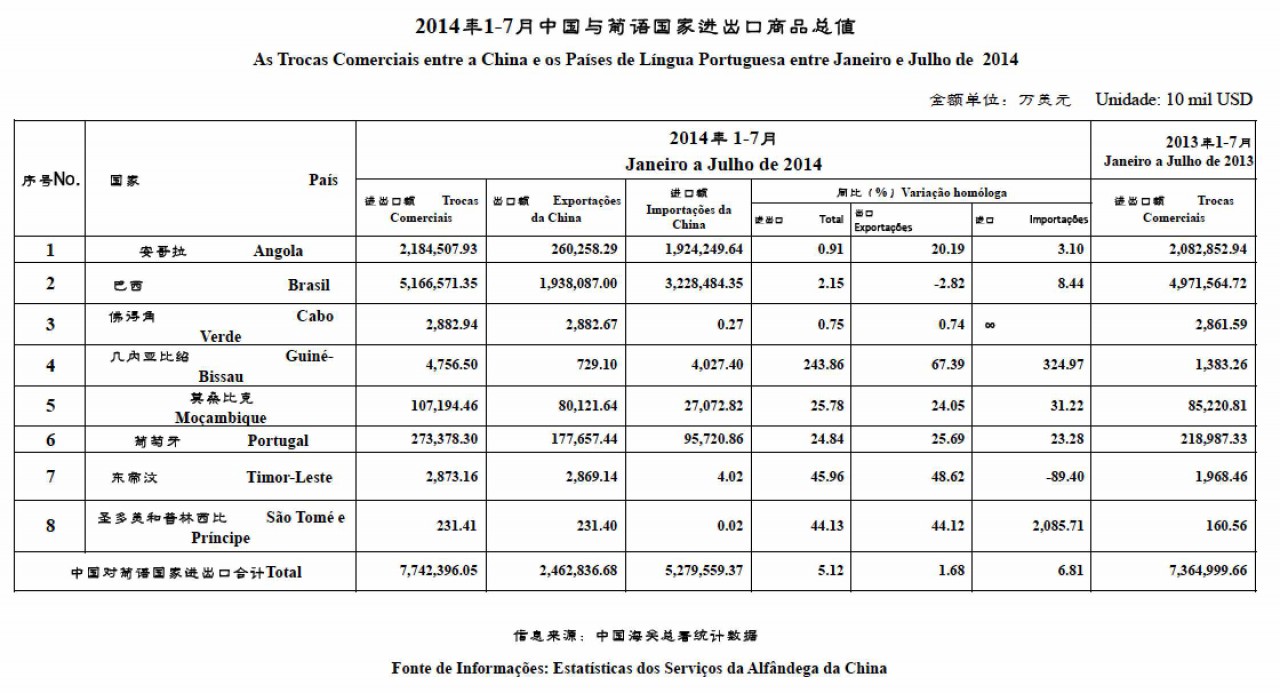 De acordo com as estatísticas dos Serviços da Alfândega da China, as trocas comerciais entre a China e os Países de Língua Portuguesa entre Janeiro e Julho de 2014 foram de US$77,42 mil milhões, um crescimento homólogo de 5,12%.