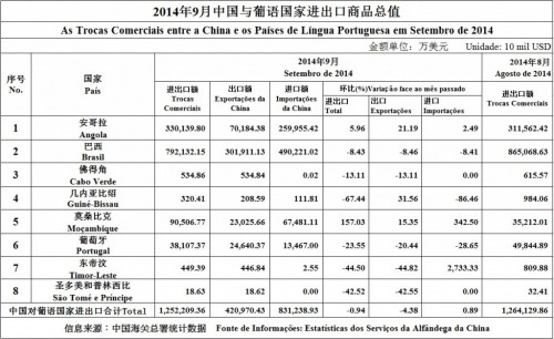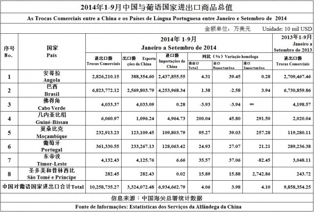 Nos primeiros nove meses do ano, o Brasil foi o principal parceiro lusófono da China, registando trocas comerciais globais no valor de 68,23 mil milhões de dólares, uma subida de 1,38 por cento face aos primeiros nove meses de 2013.