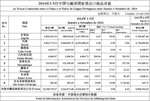 O comércio entre a China e os Países de Língua Portuguesa aumentou 4,06 por cento nos primeiros nove meses de 2014 para um total de 102,59 mil milhões de dólares, de acordo com dados dos Serviços da Alfândega da China.