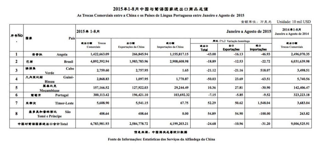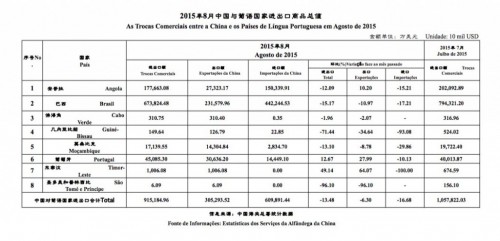 De acordo com as estatísticas dos Serviços da Alfândega da China, as trocas comerciais entre a China e os Países de Língua Portuguesa de Janeiro a Agosto de 2015 foram de US$67,840 mil milhões, um decréscimo homólogo de 24,68 por cento.