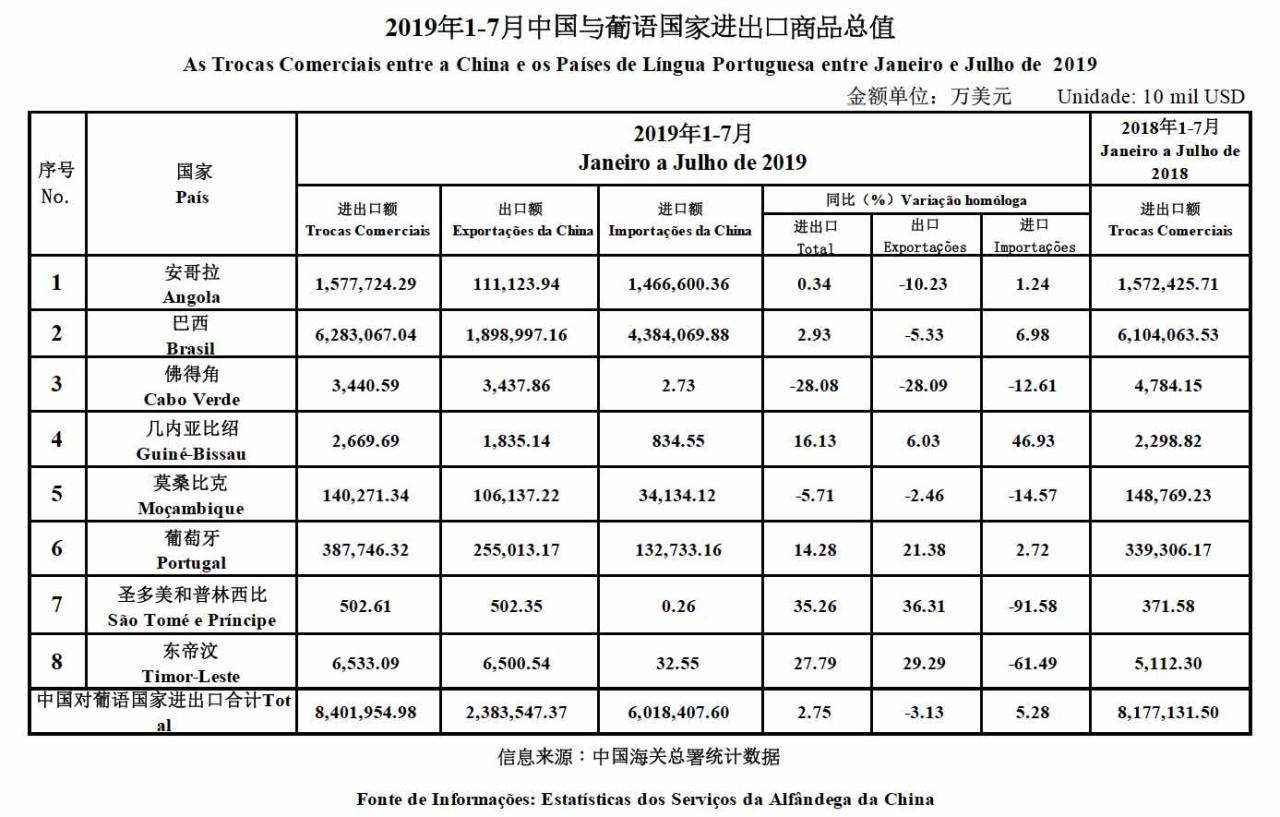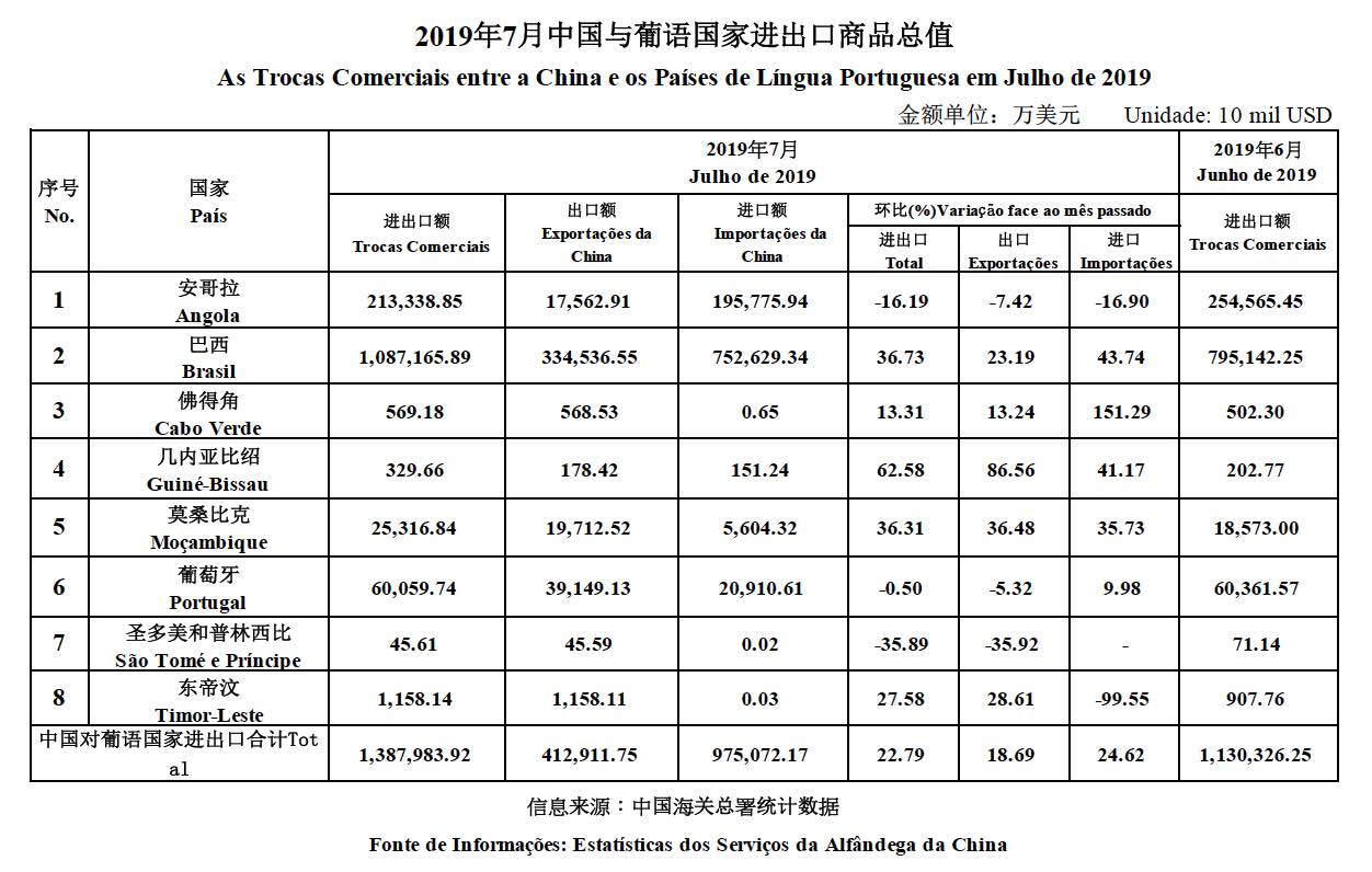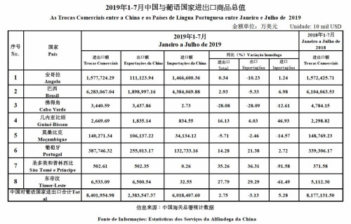 De acordo com as estatísticas dos Serviços da Alfândega da China, as trocas comerciais entre a China e os Países de Língua Portuguesa de Janeiro a Julho de 2019 foram de US$84,020 mil milhões, um aumento homólogo de 2.75 por cento.