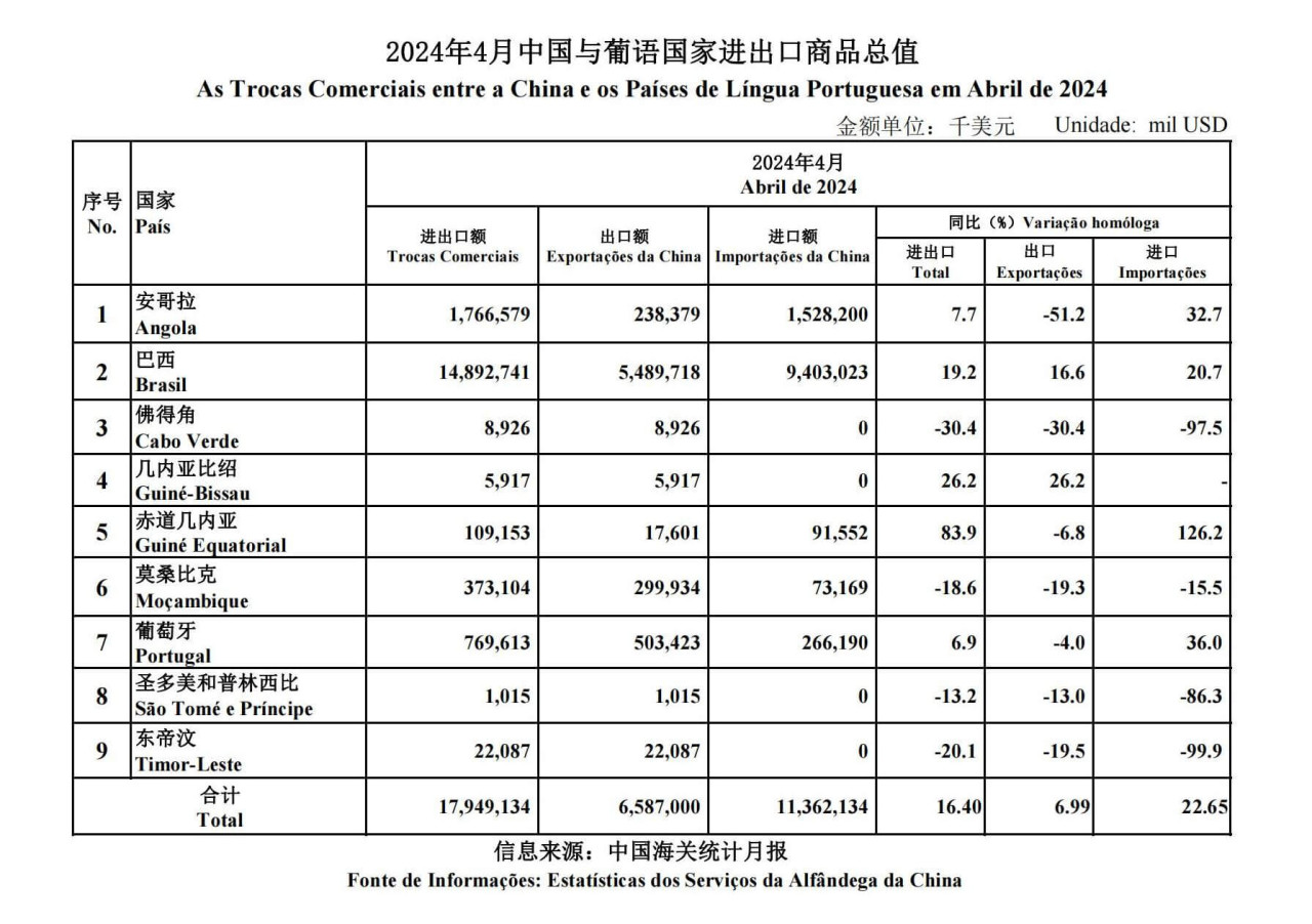 De acordo com os dados de Estatísticas dos Serviços da Alfândega da China (encontra-se na tabela anexada), as trocas comerciais entre a China e os Países de Língua Portuguesa de Janeiro a Abril de 2024 foram de 72,166 mil milhões de dólares, registando um aumento homólogo de 18,37 %. As importações da China dos Países de Língua Portuguesa foram de 46,335 mil milhões de dólares, um aumento homólogo de 22,92%, enquanto as exportações da China para os Países de Língua Portuguesa foram de 25,831 mil milhões de dólares, um aumento homólogo de 11,01%.