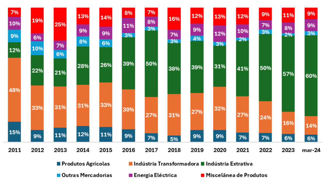 Principais produtos de exportação em Moçambique (2011-Março 2024) Fonte: Banco de Moçambique, 2023