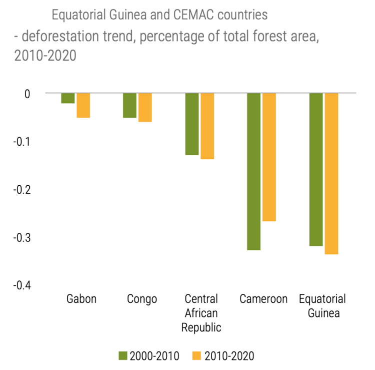 As florestas da Guiné Equatorial estão actualmente a sofrer graves danos, principalmente devido ao abate ilegal de árvores, à exploração insustentável da madeira e à expansão agrícola. De acordo com a Organização das Nações Unidas para a Alimentação e a Agricultura (FAO), a Guiné Equatorial apresenta a taxa de desflorestação mais elevada da Comunidade Económica e Monetária da África Central (CEMAC), que deverá aumentar para cerca de 0,35% entre 2010 e 2020.