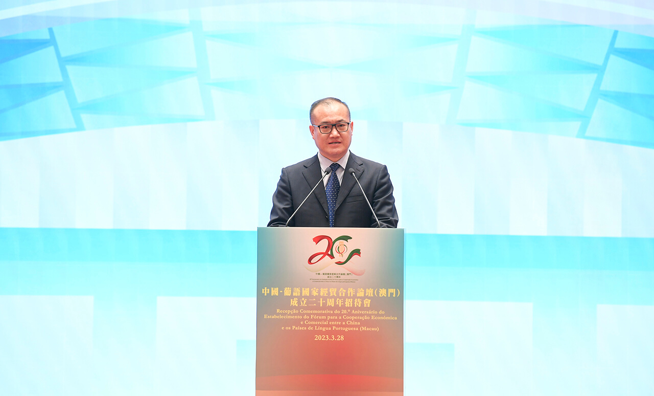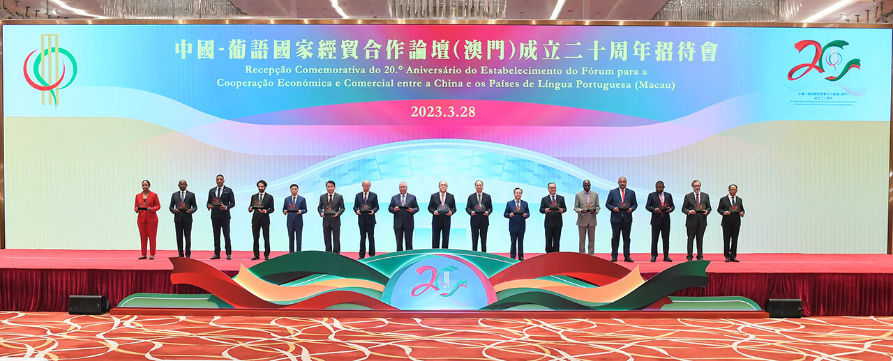 A 28 de Março, realizou-se a Recepção Comemorativa do 20.º Aniversário do Estabelecimento do Fórum para a Cooperação Económica e Comercial entre a China e os Países de Língua Portuguesa (Macau), no Complexo da Plataforma de Serviços para a Cooperação Comercial entre a China e os Países de Língua Portuguesa. O Chefe do Executivo da Região Administrativa Especial de Macau, Dr. Ho Iat Seng, o Vice-Presidente do Comité Nacional da Conferência Consultiva Política do Povo Chinês, Dr. Ho Hau Wah, o Director do Gabinete de Ligação do Governo Popular Central na Região Administrativa Especial de Macau, Dr. Zheng Xincong, o Comissário do Comissariado do Ministério dos Negócios Estrangeiros da China na Região Administrativa Especial de Macau, Dr. Liu Xianfa, o Director-Geral Adjunto do Departamento dos Assuntos de Taiwan, Hong Kong, e Macau do Ministério do Comércio da China, Dr. Li Xiaohui, o Secretário-Geral do Secretariado Permanente do Fórum de Macau, Dr. Ji Xianzheng, a Decana dos Embaixadores dos Países de Língua Portuguesa acreditados na China, Embaixadora Maria Gustava, bem como os Chefes das Delegações dos Países de Língua Portuguesa marcaram presença e presidiram a Cerimónia de Lançamento das Actividades em Comemoração do 20.º Aniversário do Estabelecimento do Fórum de Macau.