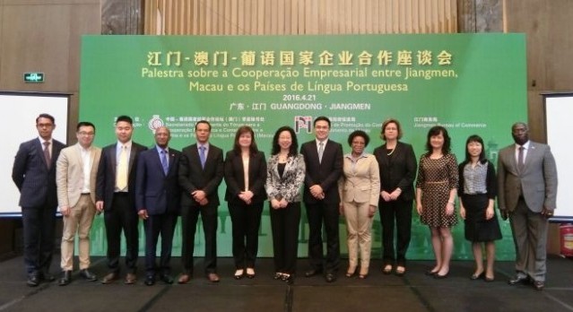 Com vista a divulgar, de melhor forma, a Plataforma de Serviços de Macau, apresentar os ambientes de negócio e investimento dos Países de Língua Portuguesa, e promover a cooperação económica e comercial entre Jiangmen na Província de Guangdong, Macau e os Países de Língua Portuguesa, o Secretariado Permanente do Fórum para a Cooperação Económica e Comercial entre a China e os Países de Língua Portuguesa (Macau), o Instituto de Promoção do Comércio e do Investimento de Macau (IPIM) e a Administração do Comércio do Município de Jiangmen organizaram uma Palestra sobre a Cooperação Empresarial entre Jiangmen, Macau e os Países de Língua Portuguesa, hoje, no Município de Jiangmen.