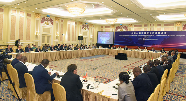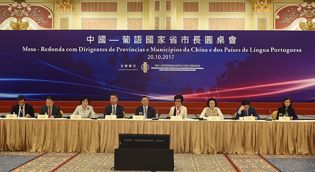 Realizou-se na manhã do dia 20 de Outubro a Mesa-Redonda com Dirigentes de Províncias e Municípios da China e dos Países de Língua Portuguesa, evento organizado pelo Fórum para a Cooperação Económica e Comercial entre a China e os Países de Língua Portuguesa (Macau), na Sala Florence do Centro de Convenções e Exposições do Venetian Macao. A Mesa-Redonda contou com a presença do Secretário para a Economia e Finanças da RAEM, Dr. Leong Vai Tac, do Sub-Director do Gabinete de Ligação do Governo Popular Central na RAEM, Dr. Yao Jian, do Vice-Governador da Província de Jiangsu, Dr. Chen Zhenning, da Comissária em Exercício do Gabinete do Comissariado do Ministério dos Negócios Estrangeiros da República Popular da China na RAEM, Dra. Wang Dong, do Secretário de Estado do Plano e Integração Regional da Guiné-Bissau, Dr. José Biai, do Governador da Província do Niassa de Moçambique, Dr. Arlindo Chilundo, do Presidente da Câmara Distrital de Cantagalo de São Tomé e Príncipe, Dr. Paulo Jorge de Carvalho, da Secretária-Geral do Secretariado Permanente do Fórum de Macau, Dra. Xu Yingzhen, da Directora-Geral da Delegação Comercial do Departamento dos Assuntos Económicos do Gabinete de Ligação do Governo Central da República Popular da China na RAEM, Dra. Chen Xing, do Adjunto do Director-Geral Adjunto do Departamento dos Assuntos Económicos do Gabinete de Ligação do Governo Central da República Popular da China na RAEM, Dr. Wang Jiabao, dos Corpos Diplomáticos dos Países de Língua Portuguesa em Pequim, e de Dirigentes Municipais e Provinciais do Interior da China e dos Países de Língua Portuguesa.