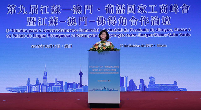 No dia 17 de Outubro foi inaugurada em Macau a 9ª Cimeira para o Desenvolvimento Comercial e Industrial da Província de Jiangsu, Macau e os Países de Língua Portuguesa e Fórum para a Cooperação entre Jiangsu-Macau-Cabo Verde, organizada pelo Governo Popular da Província de Jiangsu, em colaboração com o Secretariado Permanente do Fórum de Macau. A cerimónia de inauguração contou com a presença do Vice-Governador do Governo Popular da Província de Jiangsu, Dr. Guo Yuanqiang, o Subdirector do Gabinete de Ligação do Governo Popular Central na RAEM, Dr. Yao Jian, a Subcomissária do Comissariado do Ministério dos Negócios Estrangeiros da China na RAEM, Dra. Wang Dong, o Ministro da Indústria, Comércio e Energia de Cabo Verde, Dr. Alexandre Dias Monteiro, a Ministra da Educação de Cabo Verde, Dra. Maritza Rosabal Peña, a Secretária-Geral do Secretariado Permanente do Fórum de Macau, Dra. Xu Yingzhen, a Presidente do Instituto de Promoção do Comércio e do Investimento de Macau (IPIM), Dra. Irene Va Kuan Lau, o Corpo Diplomático dos Países de Língua Portuguesa em Pequim e os Cônsules-Gerais em Macau.