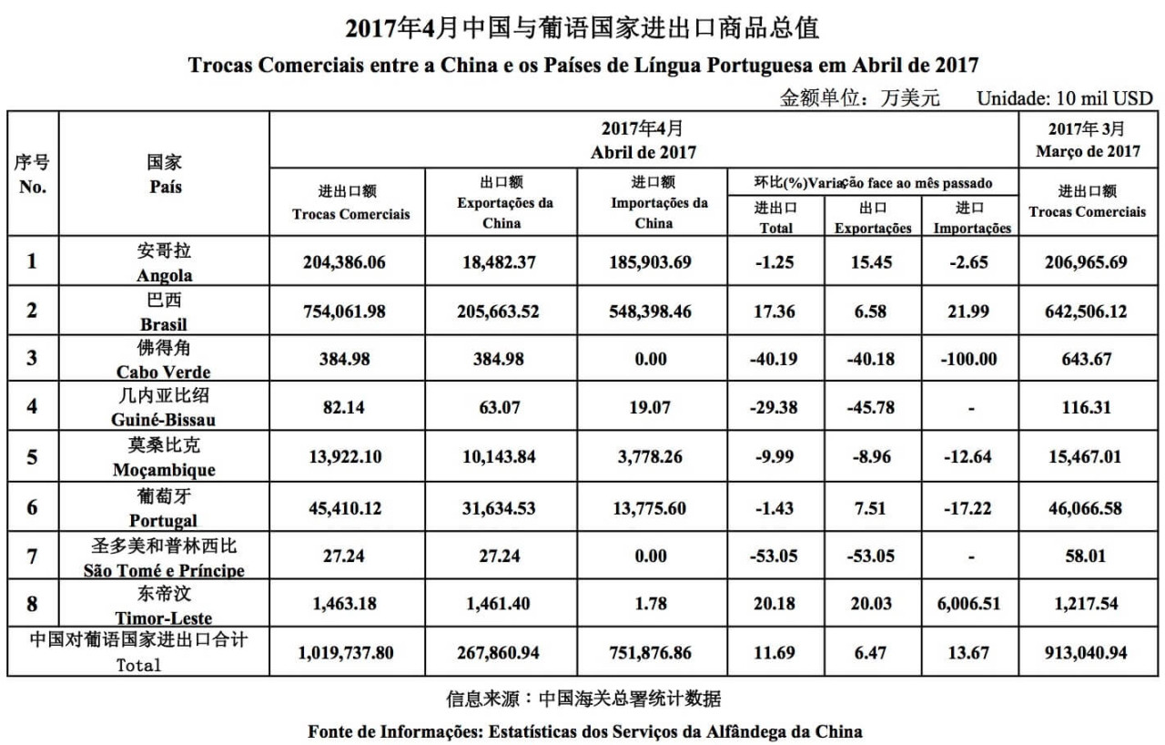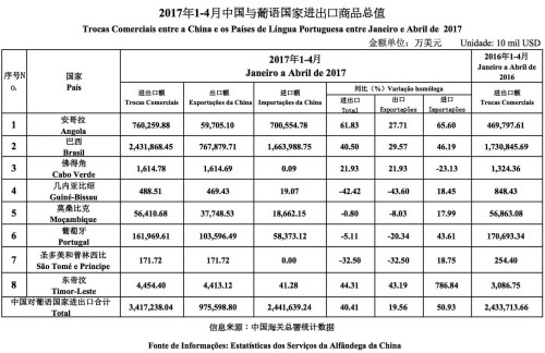 据中国海关总署资料(详见附表)显示,2017年1-4月中国与葡语国家进出口商品总值341.72亿美元,同比增长40.41%。其中中国自葡语国家进口244.16亿美元,同比增长50.93%;对葡语国家出口97.56亿美元,同比增长19.56%。2017年4月,中国与葡语国家进出口额101.97亿美元,环比增长11.69%,其中中国自葡语国家进口75.19亿美元,环比增长13.67%;对葡语国家出口26.79亿美元,环比增长6.47%。
