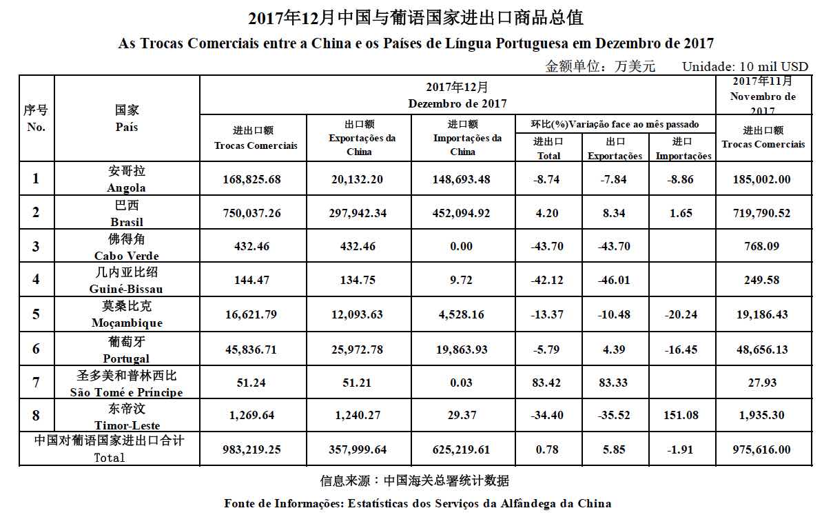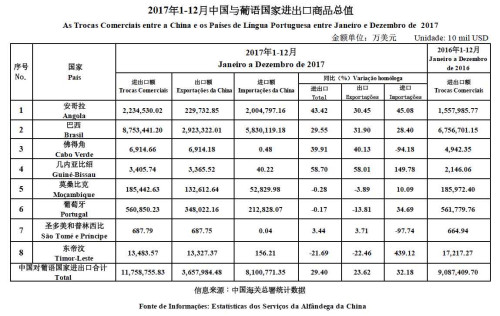 据中国海关总署资料(详见附表)显示,2017年1-12月中国与葡语国家进出口商品总值1175.88亿美元,同比增长29.40%。其中中国自葡语国家进口810.08亿美元,同比增长32.18%;对葡语国家出口365.80亿美元,同比增长23.62%。2017年12月,中国与葡语国家进出口额98.32亿美元,环比增长0.78%,其中中国自葡语国家进口62.52亿美元,环比下降1.91%;对葡语国家出口35.80亿美元,环比增长5.85%。
