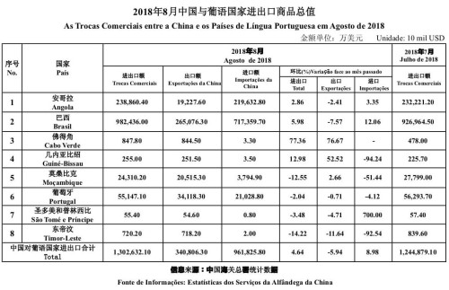 据中国海关总署资料(详见附表)显示,2018年1-8月中国与葡语国家进出口商品总值952.55亿美元,同比增长21.47%。其中中国自葡语国家进口672.32亿美元,同比增长22.00%;对葡语国家出口280.23亿美元,同比增长20.21%。2018年8月,中国与葡语国家进出口总额130.26亿美元,环比增长4.64%,其中中国自葡语国家进口96.18亿美元,环比增长8.98%;对葡语国家出口34.08亿美元,环比下降5.94 %。