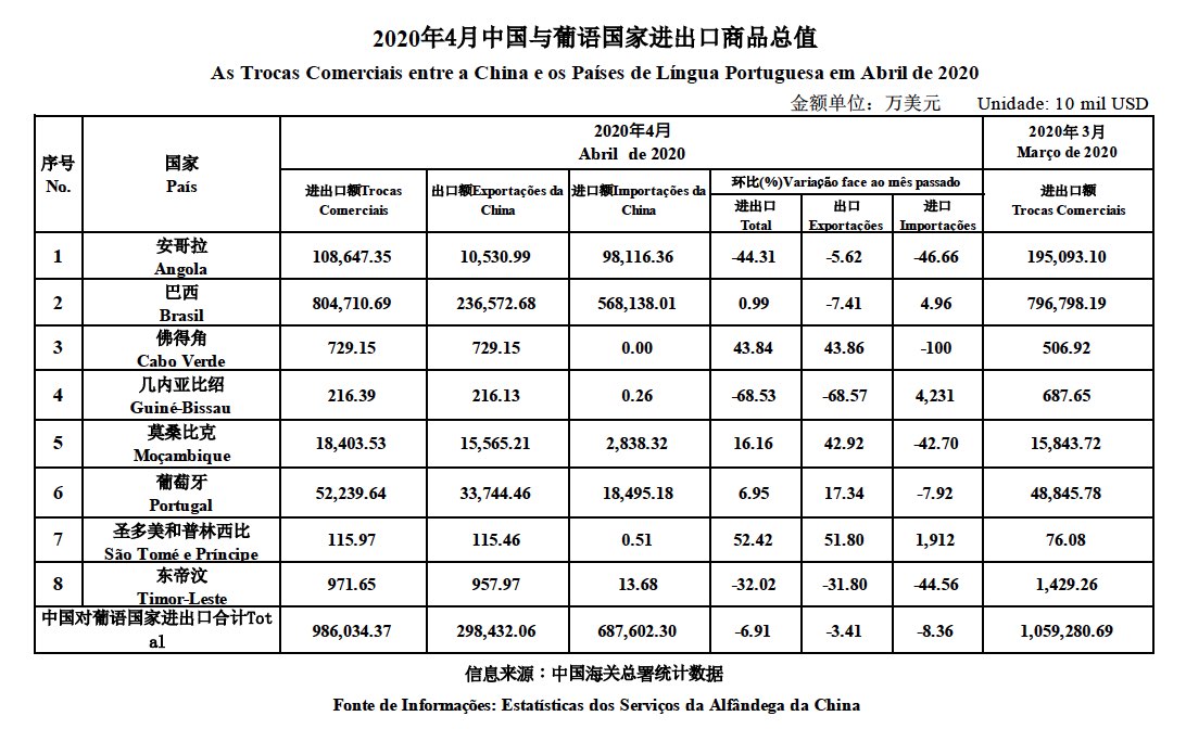 据中国海关总署资料(详见附表)显示,2020年1-4月中国与葡语国家进出口商品总值418.28億美元,同比下降9.57%。其中中国自葡语国家进口301.03億美元,同比下降10.74%;对葡语国家出口117.25億美元,同比下降6.42%。2020年4月,中国与葡语国家进出口额98.6億美元,环比下降6.91%,其中中国自葡语国家进口68.76億美元,环比下降8.36%,对葡语国家出口29.84億美元,环比下降3.41%。