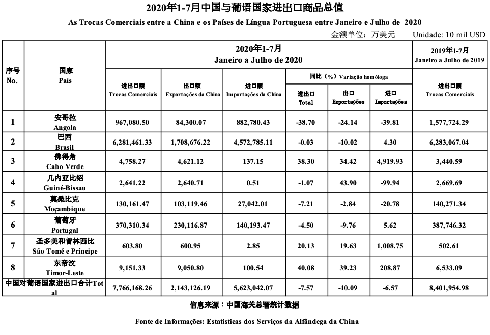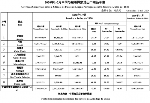 据中国海关总署资料(详见附表)显示,2020年1-7月中国与葡语国家进出口商品总值776.62亿美元,同比下降7.57%。其中中国自葡语国家进口562.3亿美元,同比下降6.57%;对葡语国家出口214.31亿美元,同比下降10.09%。2020年7月,中国与葡语国家进出口额130.63亿美元,环比增长1.87%,其中中国自葡语国家进口94.88亿美元,环比下降1.61%;对葡语国家出口35.75亿美元,环比增长12.42 %。