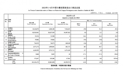 据中国海关数据(详见附表)显示,2023年1-6月中国与葡语国家进出口商品总值1011.01亿美元,同比下降3.22%。其中中国自葡语国家进口652.99亿美元,同比下降5.84%;对葡语国家出口358.02亿美元,同比增长1.98%。2023年6月,中国与葡语国家进出口总额196.21亿美元,同比下降5.13%,其中中国自葡语国家进口127.63亿美元,同比下降4.45%;对葡语国家出口68.58亿美元,同比下降6.38%。