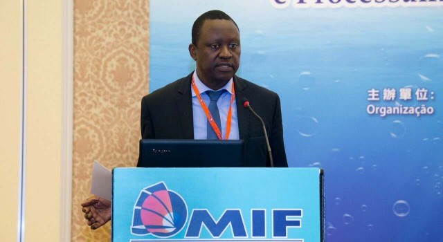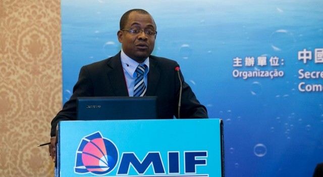中葡论坛(澳门)常设秘书处常和喜秘书长丶中央驻澳门特区联络办公室经济部陈星副部长兼贸易处负责人丶中国外交部驻澳门特派员公署综合部汪元副主任丶澳门贸易投资促进局吴爱华执行委员丶安哥拉共和国渔业部厅长Nelson Samuel丶巴西外交部外交官Daniel Costa Figueiredo丶几内亚比绍渔业及资源部部长经济顾问António Domingos Tubento丶莫桑比克国家渔业局局长Simeão Lopes丶代表中葡论坛派驻代表及葡萄牙经贸投资促进局贸易投资官员Manuela Ferreira Dias及东帝汶农业及渔业部渔业局局长Acacio Guterres等嘉宾出席推介会, 常和喜秘书长致欢迎辞。