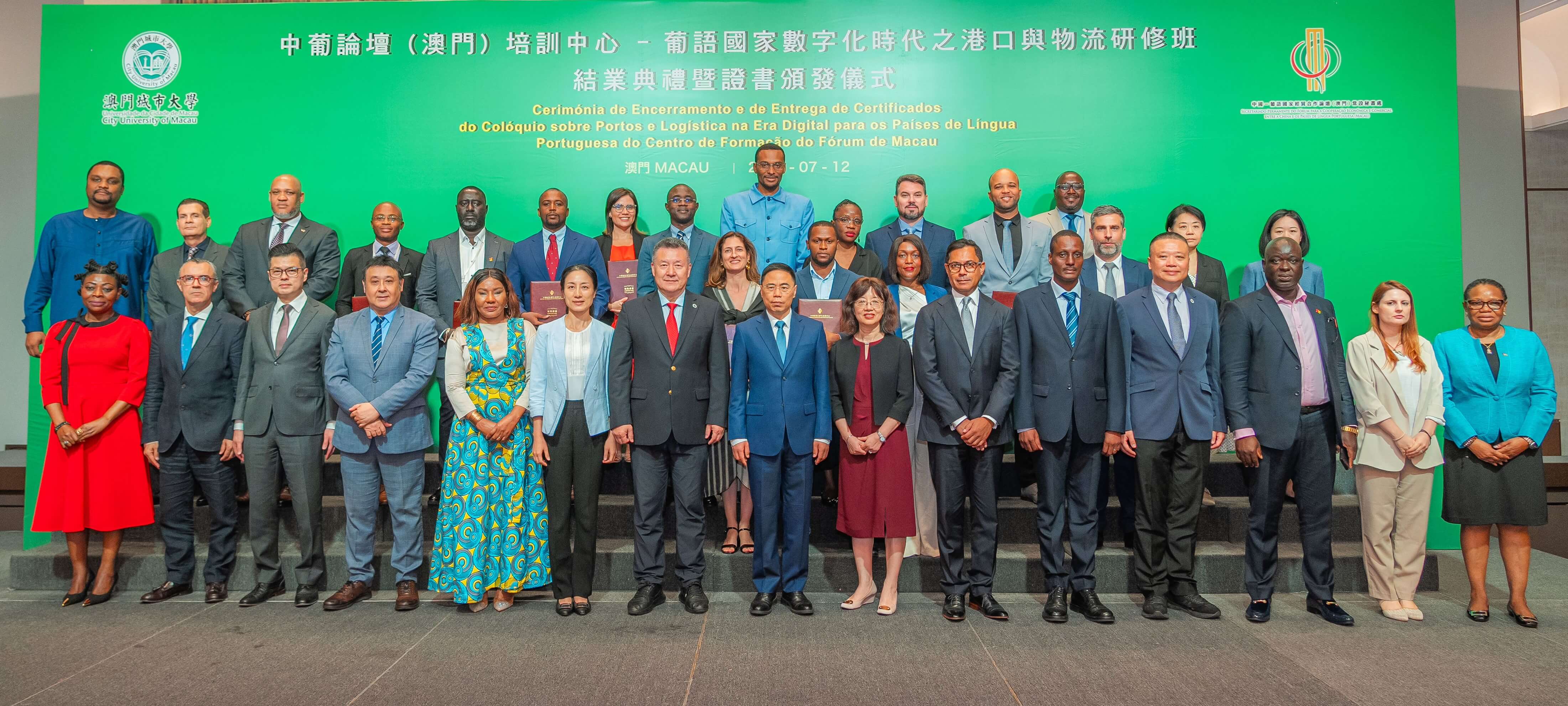 由中国—葡语国家经贸合作论坛(澳门)常设秘书处主办、澳门城市大学承办的“葡语国家数字化时代之港口与物流研修班”7月12日在澳门旅游塔举行结业典礼暨证书颁发仪式。中葡论坛(澳门)常设秘书处秘书长季先峥、澳门城市大学校长刘骏、研修班轮值班长Herlander Rossi da Costa Medeiros等出席典礼并致辞。