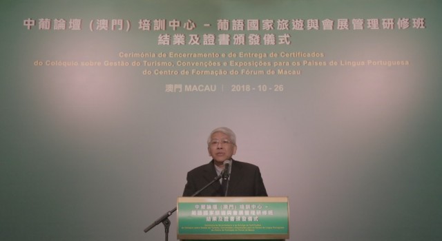 由中葡论坛(澳门)培训中心主办、澳门城市大学承办的”葡语国家旅游会展研修班”于10月26日假澳门美高梅宴会厅举行结业典礼暨证书颁发仪式。
