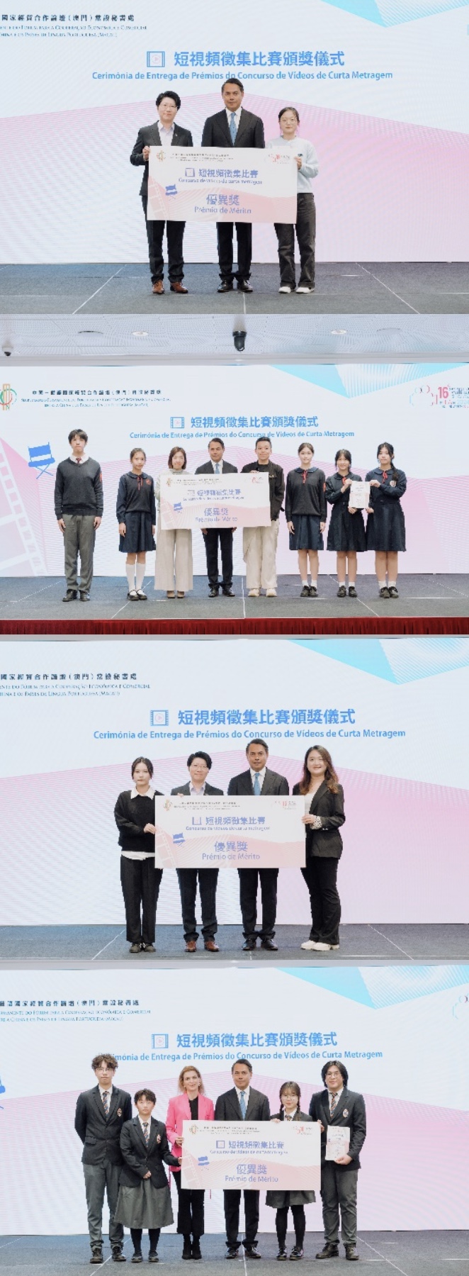 第十六届中国—葡语国家文化周于今年10月17日至20日在澳门举行,为记录活动精彩片段,主办单位特举办“第十六届中国—葡语国家文化周短视频征集比赛”,赛事活动得到澳门多所大学和中学视频创作爱好者响应,吸引29队学生踊跃报名参赛角逐。由来自中国内地、澳门、葡语国家代表组成的评审委员会依据参赛作品的主题、内容、表达手法、创意、画面、音效等进行评比,选出甲等奖1队、乙等奖2队、优异奖8队,合共11条优秀短视频作品,最终劳校中学队伍制作名为“中葡文化 同行共融”的短视频夺得甲等奖。详细得奖名单如下:
