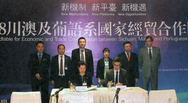 11月9日,中葡论坛(澳门)常设秘书处罗德高副秘书长和黄伟麟副秘书长代表秘书处出席“2018川澳及葡语系国家经贸合作圆桌会”,并见证了四川省商务厅与澳门贸促局签署《关于进一步促进川澳经贸合作备忘录》。