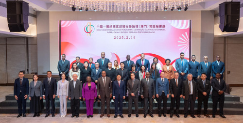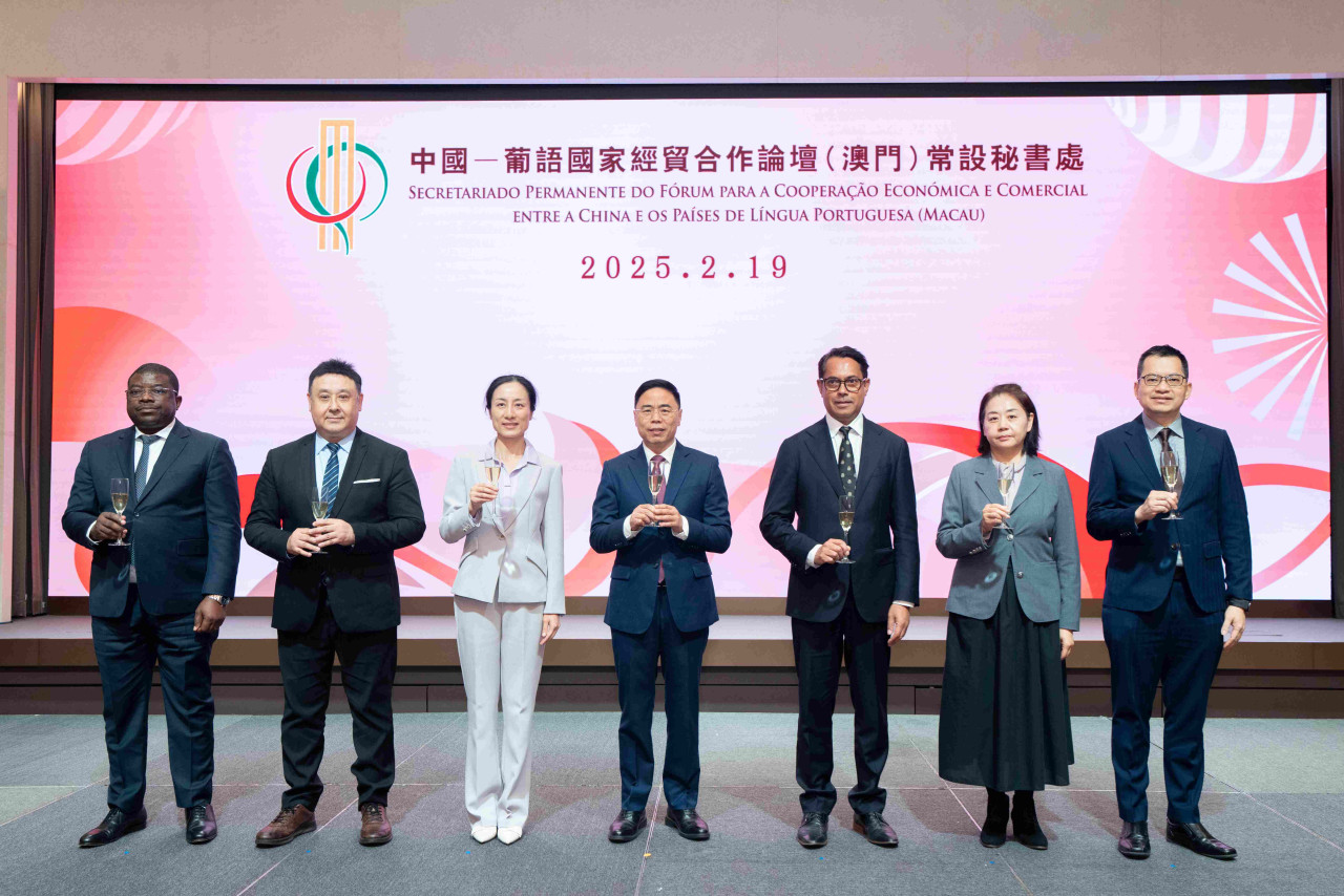 2月19日,中国—葡语国家经贸合作论坛(澳门)常设秘书处于澳门旅游塔宴会厅举办招待晚宴,与葡语国家驻华外交机构代表和在澳中文、葡文、英文传媒负责人沟通交流。季先峥秘书长偕常设秘书处全体成员出席活动。